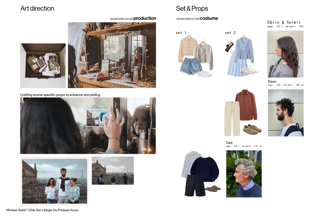As Art Director for Ode Sur L’élégie Ou Presque Azure (Dir. Soroush Marouf, Paris), I helped shape a visual world that lives in the tension between documentary realism and poetic invention. My role wasn’t only to make elements, but to build atmosphere and meaning—proposing unconventional approaches that expanded the director’s vision and sharpened the film’s emotional register. Working closely with the team, I developed the visual language across sets, textures, graphic elements, frame-by-frame animation, the film poster, and credits, ensuring a consistent tone from pre-production through post. The result is a layered, intimate film space where each frame carries narrative weight.