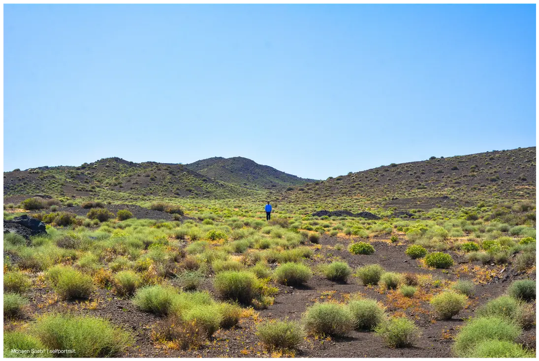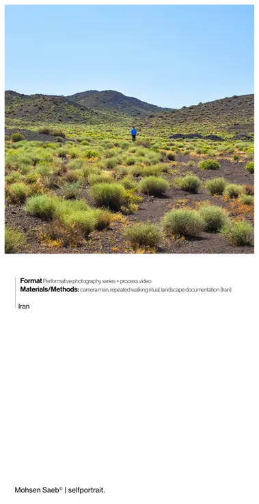 Self-Portrait begins with a simple disruption: what happens when the photographer refuses the usual position—behind the camera, or close to it—and instead lets distance do the describing? Made along highways between Iranian cities, the series is built through a recurring performative ritual. I leave the city, walk away from the road, enter the landscape, and return to the frame—again and again—until the act of making becomes a form of meditation.